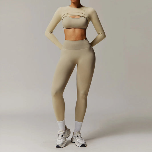 Solid Color Stretchy Long Sleeve Cardigan And Sports Bra And Ruched Booty High Waisted Legging Set
