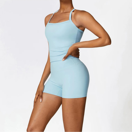 Solid Color Stretchy Halter Top And High Waisted Shorts Set