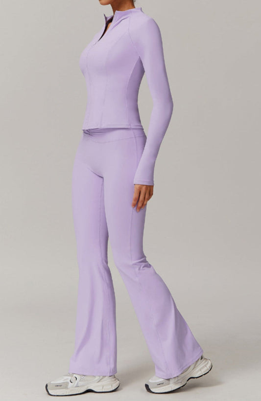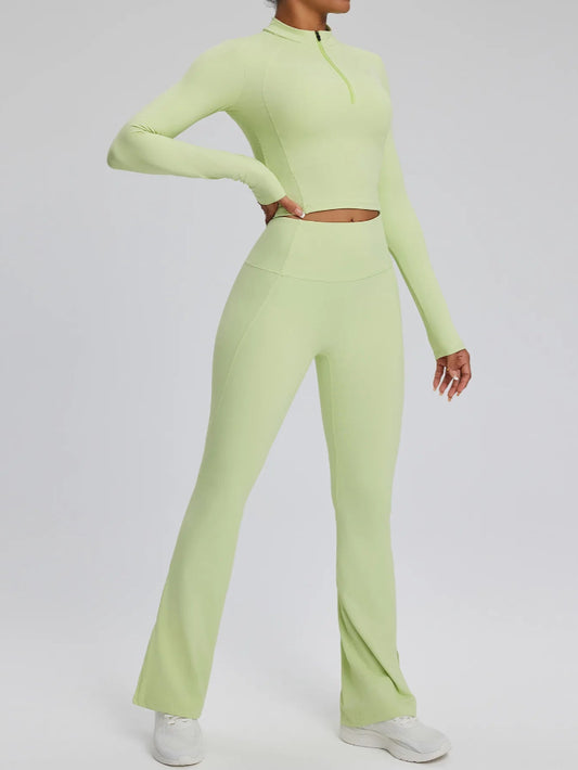 Solid Color Stretchy Patchwork Collar Quarter Zip-Up Long Sleeve And High Waisted Flare Pants Set