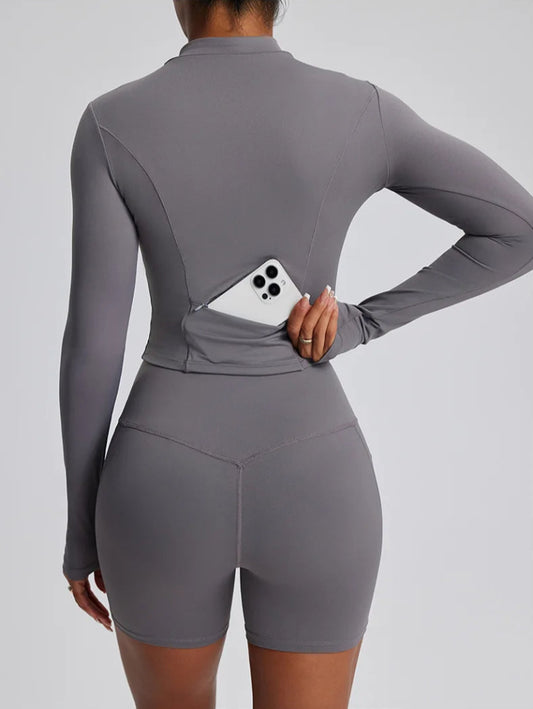 Solid Color Stretchy Patchwork Collar Quarter Zip-Up Long Sleeve And High Waisted Shorts Set