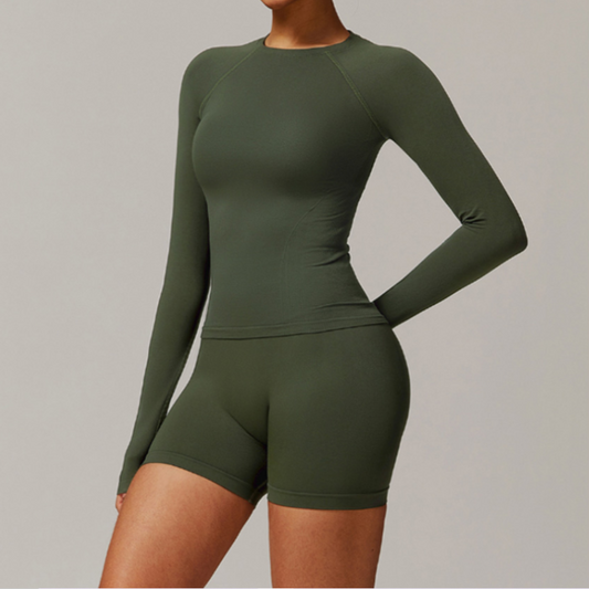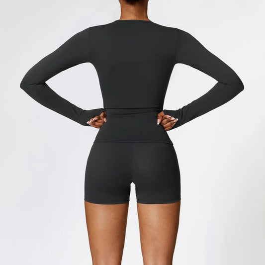 Solid Color Stretchy Long Sleeve And High Waisted Shorts Set