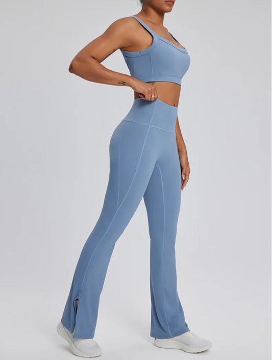 Solid Color Stretchy Patchwork Crop Thick Spaghetti Strap And High Waisted Flare Pants Set
