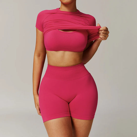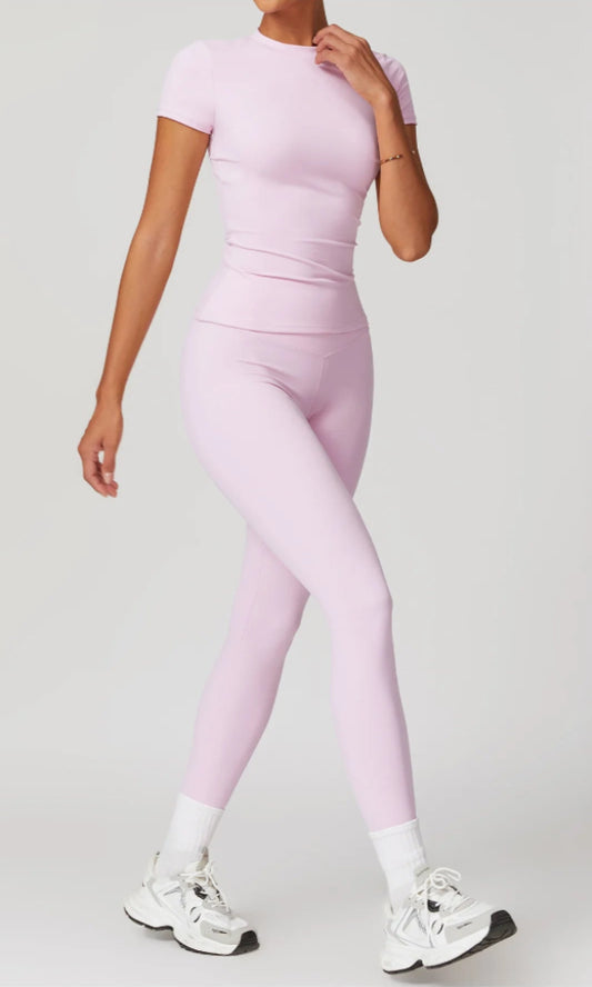 Solid Color Stretchy Short Sleeves And High Waisted Legging Set