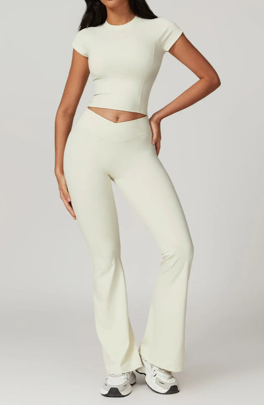 Solid Color Stretchy Short Sleeve And V-Cut High Waisted Flare Pants Set