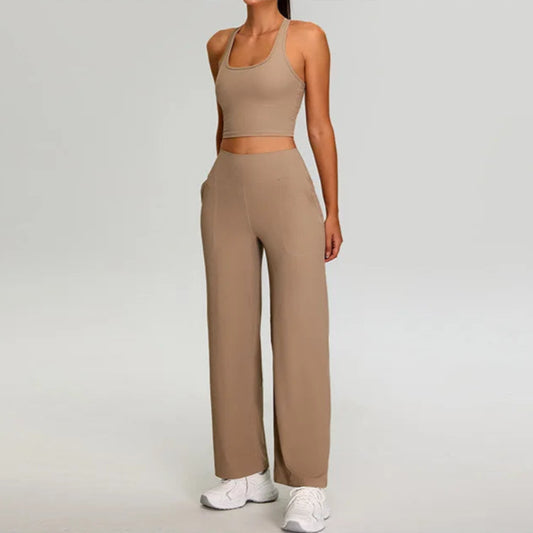 Solid Color Stretchy Sleeveless Top And High Waisted Loose Pants Set