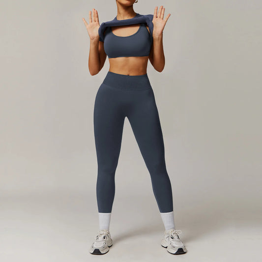 Solid Color Stretchy Sleeveless Sports Bra And High Waisted Legging Set