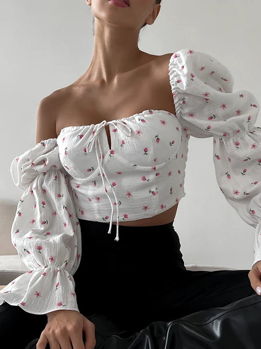 White Pink Floral Front Tie Puff Long Sleeve