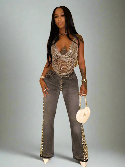 Silver Chain Drop Down Backless Halter Top