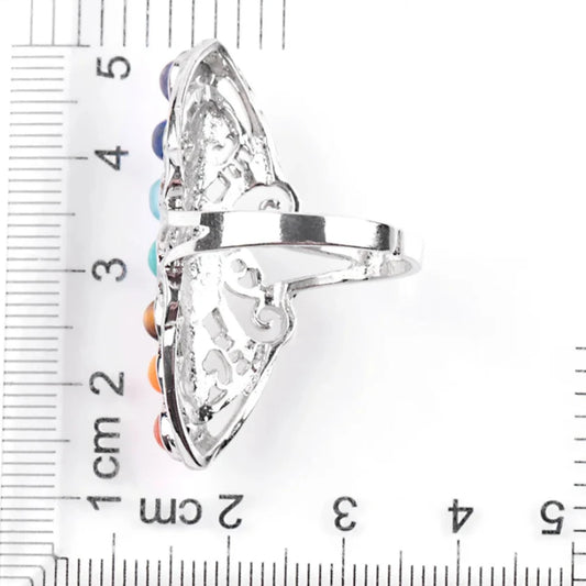 Silver Metal Swirl Hollow Out Long 7 Polished Crystal Ball Ring