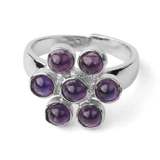 Silver Metal 7 Polished Round Crystal Flower Adjustable Ring