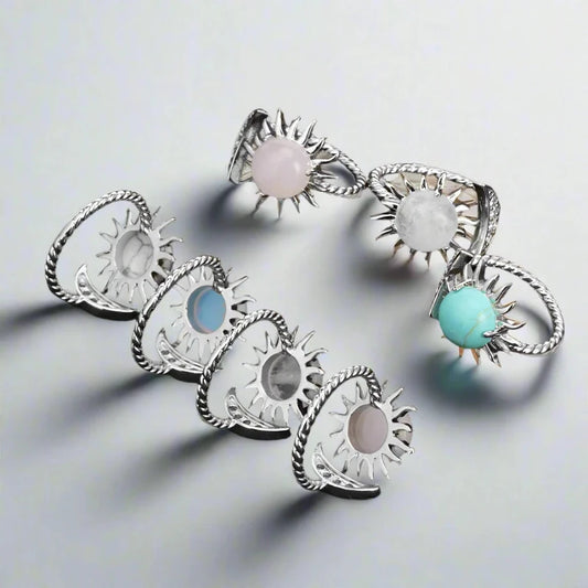 Silver Metal Twist Rhinestone Studded Moon And Polished Round Crystal Sun Ring