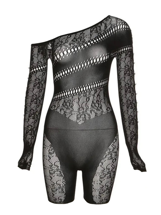 Solid Color Mesh Floral Print Hollow Out Rhinestone Studded Off Shoulder Long Sleeve Romper