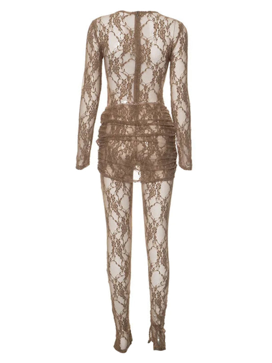Neutral Lace Skirt And Criss-Cross V-Cut Long Sleeve Jumpsuit