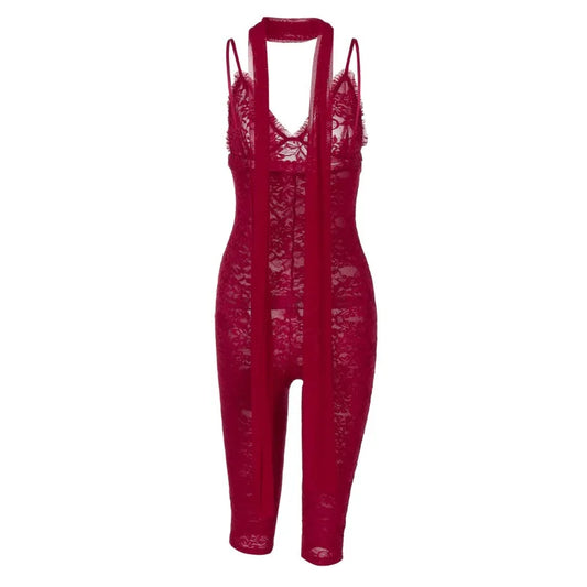 Red Lace Scarf And V-Cut Spaghetti Strap Midi Jumpsuit