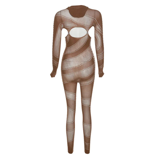 Neutral Mesh Hooded Hollow Out Heart Rhinestone Studded Long Sleeve Jumpsuit
